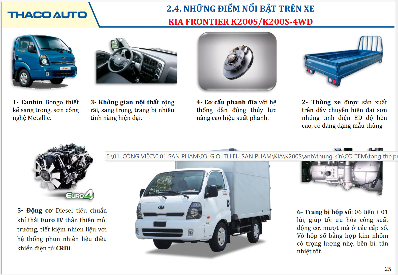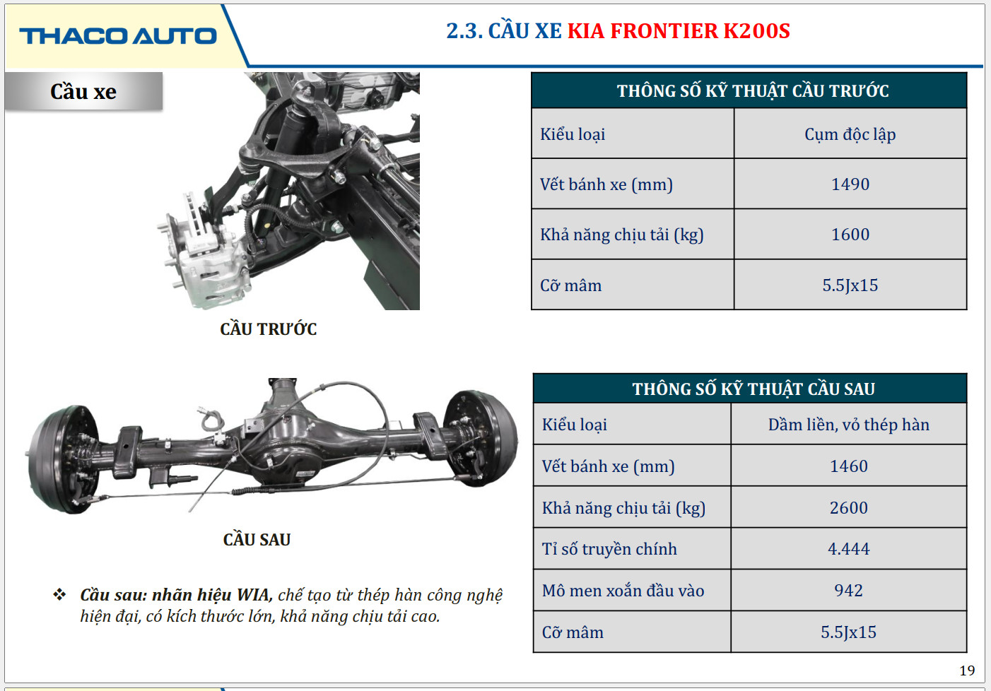 Kia New Frontier K200S, trang bị 02 phiên bản 1 cầu và 2 cầu, tải trọng 1,49 tấn, được trang bị động cơ Hyundai D4CB tiêu chuẩn khí thải Euro 4, vận hành mạnh mẽ, thân thiện với môi trường. Cabin kiểu mới, thiết kế hiện đại được sơn nhúng tĩnh điện nguyên khối và sơn màu với công nghệ Metalic, các tiện ích được trang bị sang trọng như đối với ô tô du lịch. Hộp số gồm 06 số tiến + 01 số lùi, có 2 tỉ số truyền nhanh giúp xe vận hành mạnh mẽ và linh hoạt.