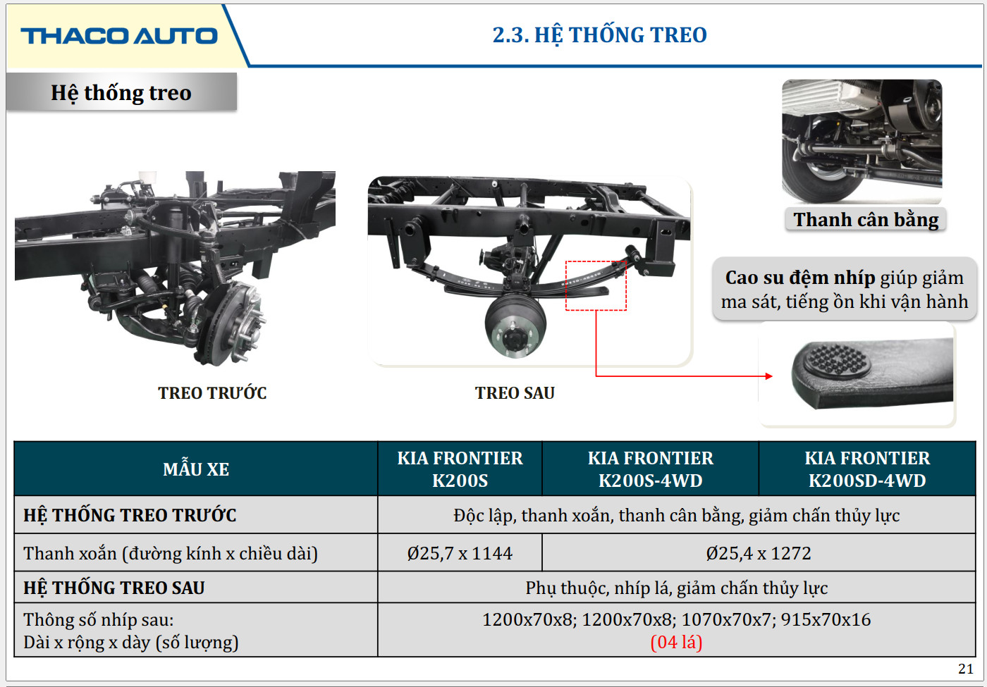 | Sau | Phụ thuộc, nhíp lá, giảm chấn thủy lực. |