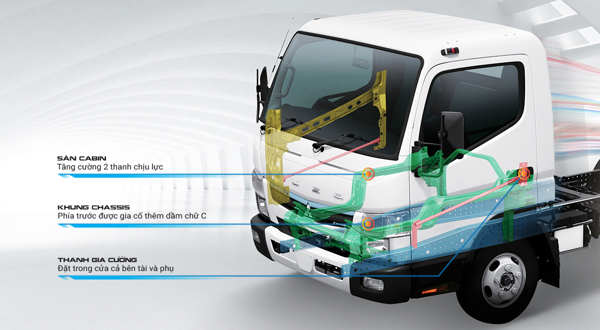 Chassis được sản xuất theo công nghệ độc quyền của Mitsubishi cho tính ổn định cao, độ cứng xoắn lớn, trọng lượng thấp, tuổi thọ cao. Đà ngang liên kết ở mặt hông tăng khả năng chịu tải, độ bền cao, dễ dàng bố trí thùng. Cấu trúc khung cửa, thanh gia cường cửa xe, sàn gia cố cabin và khung xe kết cấu hình hộp giúp cabin cứng vững, tăng độ an toàn cho người sử dụng khi có va chạm.