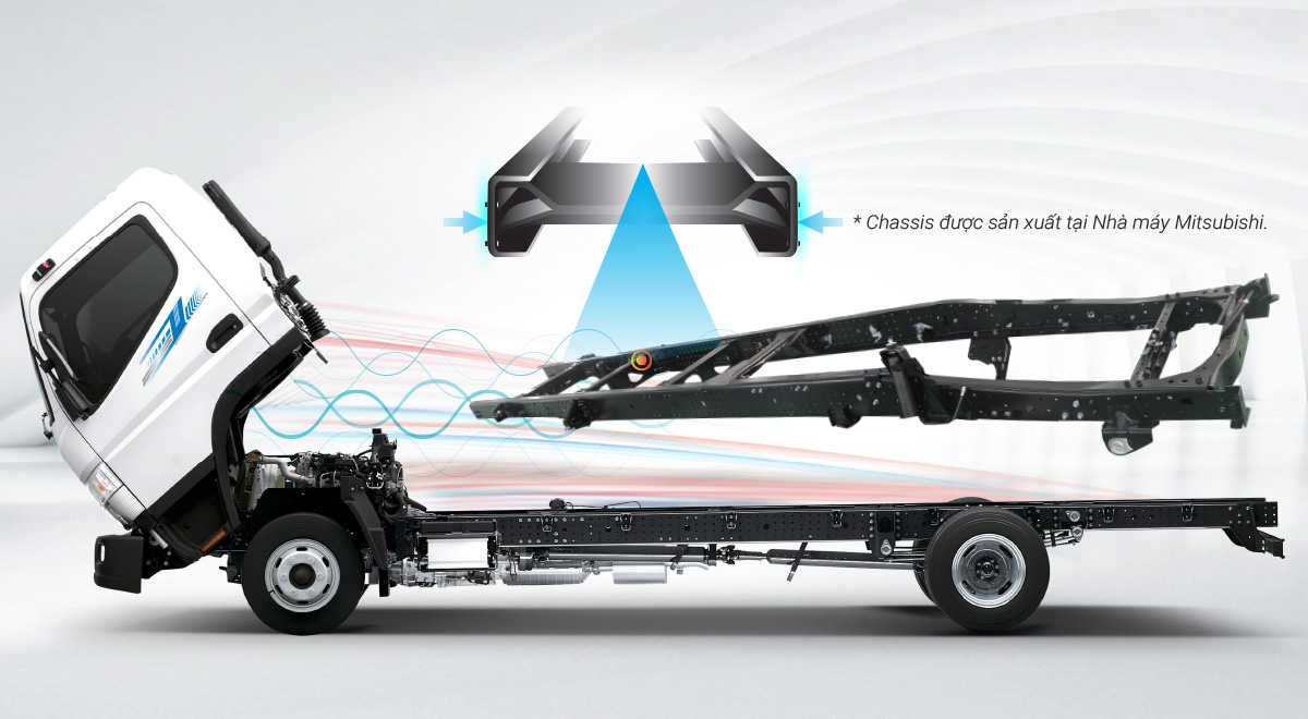 Chassis được sản xuất theo công nghệ độc quyền của Mitsubishi cho tính ổn định cao, độ cứng xoắn lớn, trọng lượng thấp, tuổi thọ cao. Đà ngang liên kết ở mặt hông tăng khả năng chịu tải, độ bền cao, dễ dàng bố trí thùng. Cấu trúc khung cửa, thanh gia cường cửa xe, sàn gia cố cabin và khung xe kết cấu hình hộp giúp cabin cứng vững, tăng độ an toàn cho người sử dụng khi có va chạm.