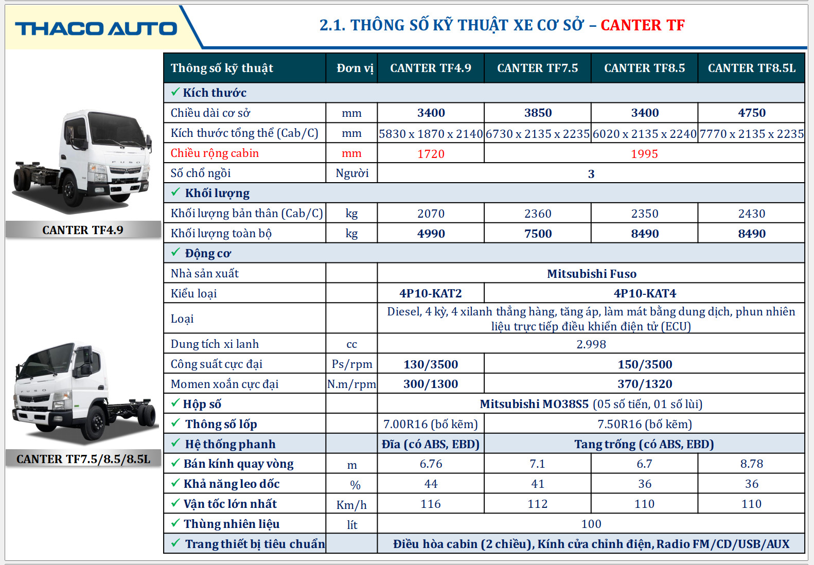 Mitsubishi Fuso Canter TF4.9, tải trọng 1.995 Kg, là dòng xe tải cao cấp với thiết kế hoàn toàn mới của Mitsubishi Nhật Bản được THACO sản xuất lắp ráp và phân phối độc quyền tại Việt Nam. Xe được trang bị động cơ Mitsubishi, tiêu chuẩn khí thải Euro 5, hệ thống phun nhiên liệu điều khiển điện tử, tiết kiệm nhiên liệu, thân thiện với môi trường. Với hệ thống treo bền bỉ, Chassis kết cấu “siêu khung gầm”, cabin vững chắc tất cả kết nối thành một khối làm gia tăng độ an toàn tuyệt đối cho người sử dụng xe. Tính năng mới trang bị thêm phanh ABS, hỗ trợ lực phanh EBD giúp di chuyển an toàn hơn.