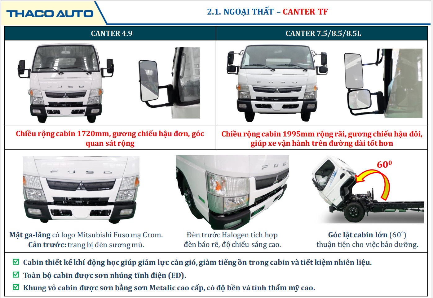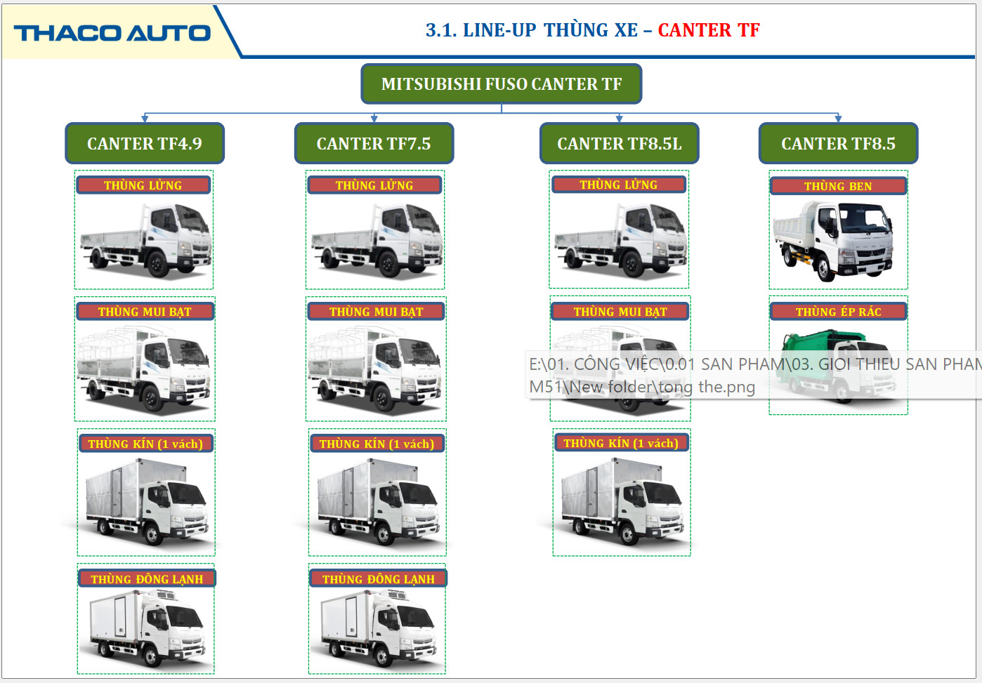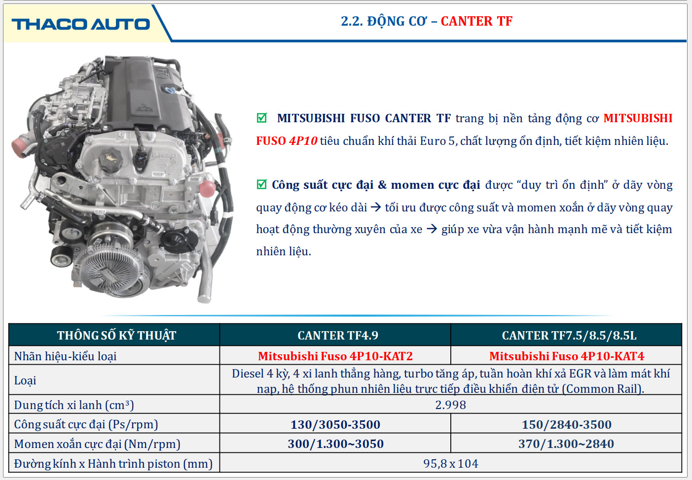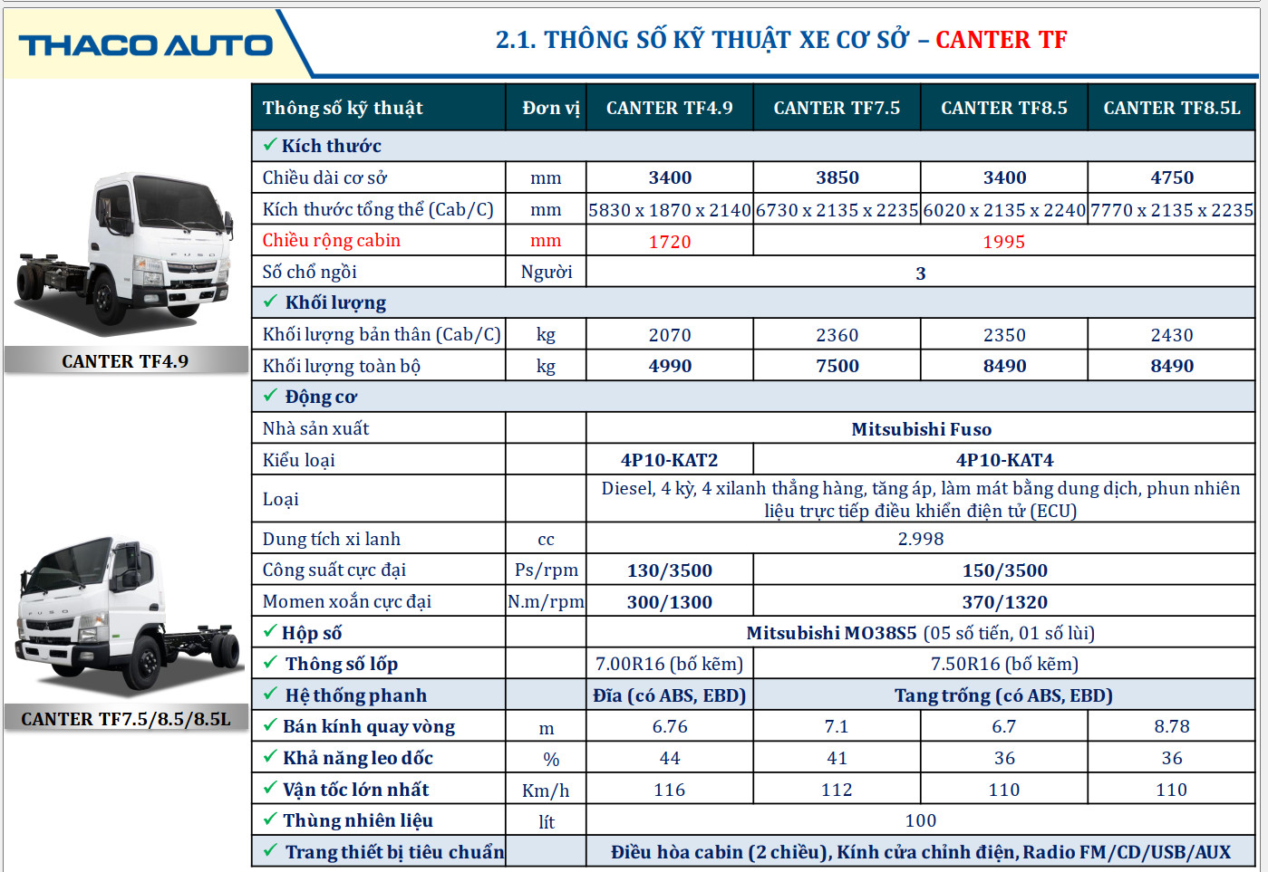 Mitsubishi Fuso Canter TF8.5L, tải trọng 4,8 tấn, là dòng xe tải cao cấp với thiết kế hoàn toàn mới của Mitsubishi Nhật Bản được THACO sản xuất lắp ráp và phân phối độc quyền tại Việt Nam. Xe được trang bị động cơ Mitsubishi, tiêu chuẩn khí thải Euro 5, hệ thống phun nhiên liệu điều khiển điện tử, tiết kiệm nhiên liệu, thân thiện với môi trường. Trang bị hệ thống Phanh ABS, phân bổ lực phanh EBD giúp tăng độ an toàn. Với hệ thống treo bền bỉ, Chassis kết cấu “siêu khung gầm”, cabin vững chắc tất cả kết nối thành một khối làm gia tăng độ an toàn tuyệt đối cho người sử dụng xe.