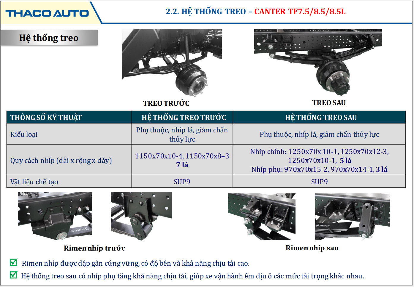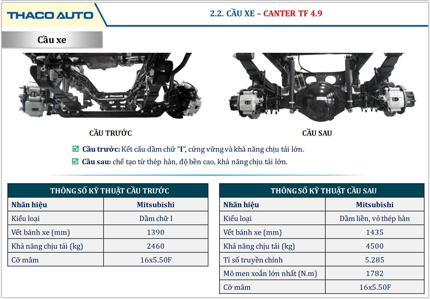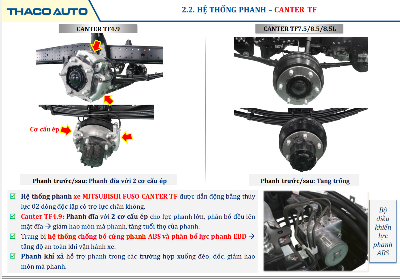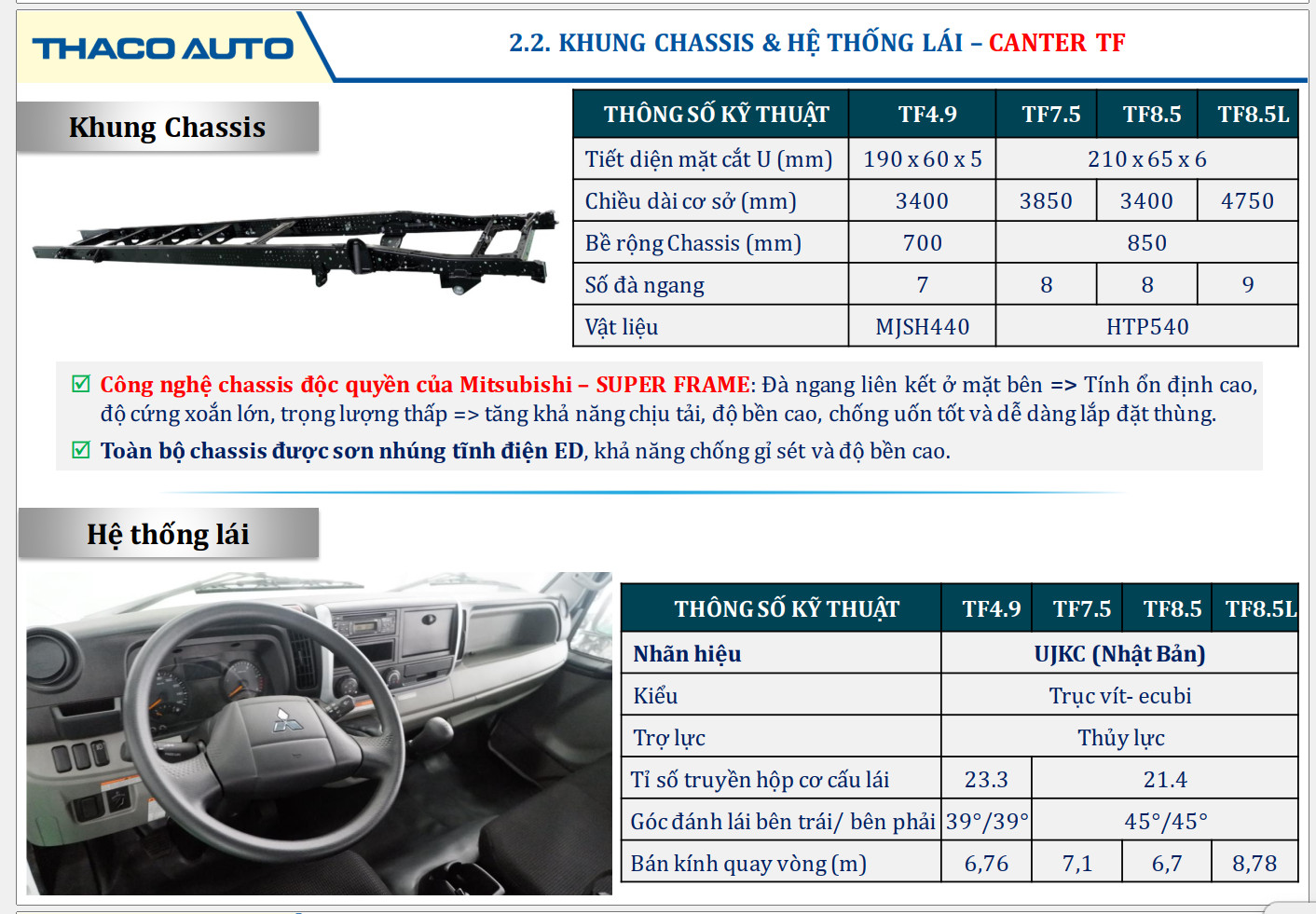 Mitsubishi Fuso Canter TF8.5L, tải trọng 4,8 tấn, là dòng xe tải cao cấp với thiết kế hoàn toàn mới của Mitsubishi Nhật Bản được THACO sản xuất lắp ráp và phân phối độc quyền tại Việt Nam. Xe được trang bị động cơ Mitsubishi, tiêu chuẩn khí thải Euro 5, hệ thống phun nhiên liệu điều khiển điện tử, tiết kiệm nhiên liệu, thân thiện với môi trường. Trang bị hệ thống Phanh ABS, phân bổ lực phanh EBD giúp tăng độ an toàn. Với hệ thống treo bền bỉ, Chassis kết cấu “siêu khung gầm”, cabin vững chắc tất cả kết nối thành một khối làm gia tăng độ an toàn tuyệt đối cho người sử dụng xe.