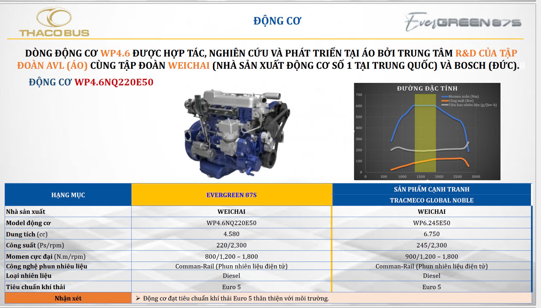Thaco Evergreen 87s được trang bị Động cơ Weichai công nghệ mới với hệ thống phun nhiên liệu điều khiển điện tử Common Rail System (CRD-i), mạnh mẽ và tiết kiệm nhiên liệu, đáp ứng tiêu chuẩn khí thải Euro IV, thân thiện với môi trường. Ưu điểm nổi bật về công nghệ nằm ở động cơ xe được đặt phía sau, giúp bố trí sàn rộng và thoáng. Hệ thống treo khí nén được trang bị loại 6 bầu hơi bởi nhà cung cấp Komman – Đức giúp xe vận hành êm dịu và ổn định trên mọi điều kiện địa hình. Thaco Evergreen 87s được trang bị đầy đủ tiện nghi cao cấp, đồng thời ghi điểm bởi nhiều tính năng vượt trội, hiệu quả, kinh tế và thân thiện với môi trường, nội thất tiêu chuẩn sang trọng và đẳng cấp, Thaco Evergreen 87s phù hợp hướng đến phục vụ hoạt động du lịch, lữ hành đồng thời góp phần phát triển giao thông đô thị Việt Nam chất lượng, văn minh trong thời đại mới.