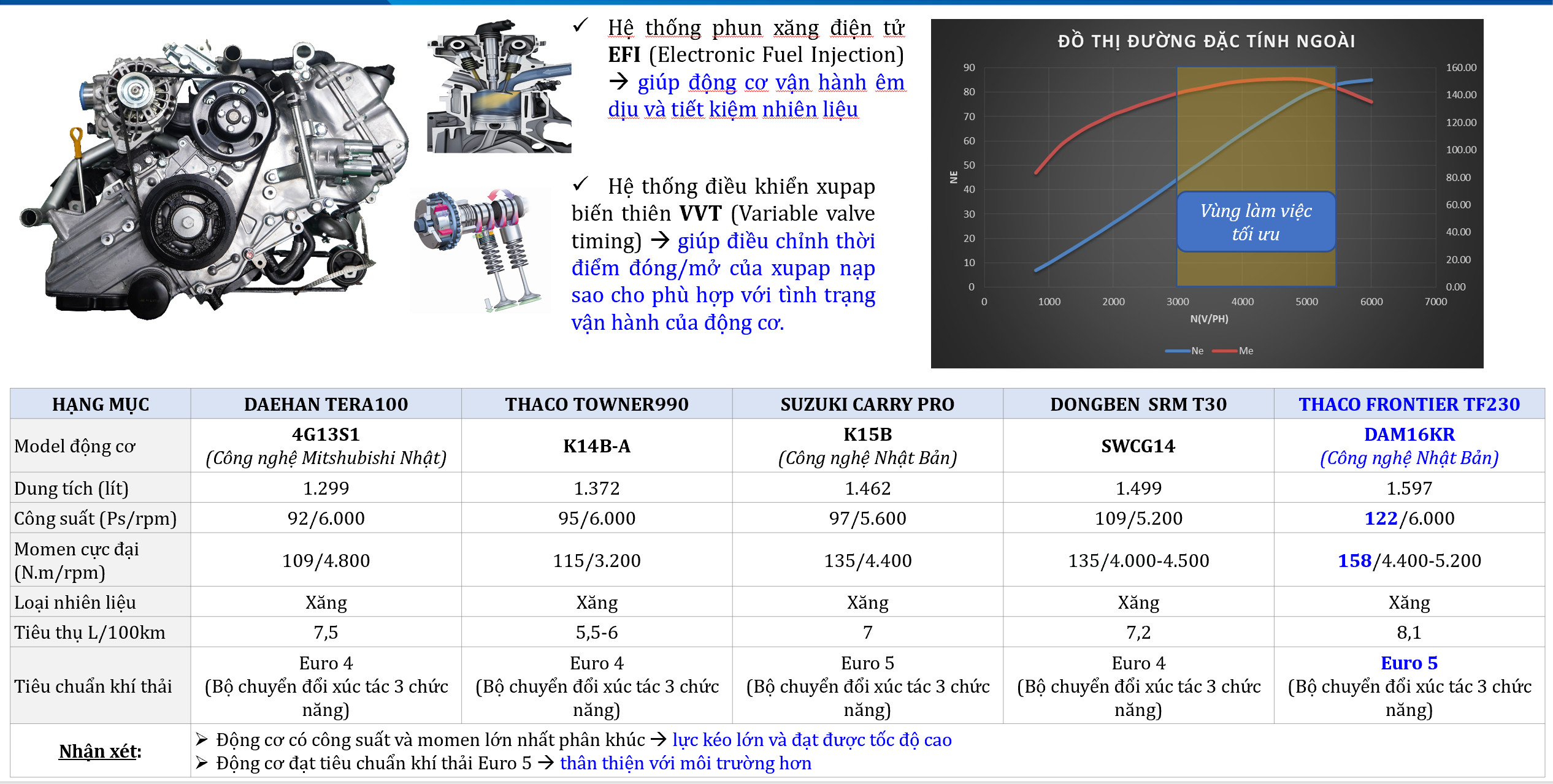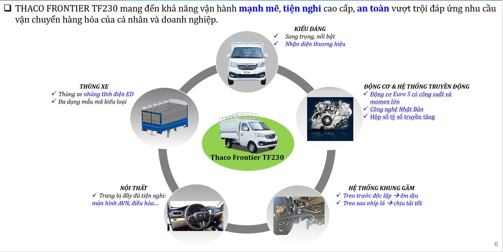 THACO Frontier TF230 là dòng sản phẩm xe tải nhẹ hoàn toàn mới, được thiết kế và ra mắt vào tháng 06/2023. Thay đổi hoàn toàn nội ngoại thất hiện đại và đẳng cấp hơn. Trang bị Động cơ Công nghệ Mitsubishi thân thiện với môi trường và tiết kiệm nhiên liệu. Sản phẩm có kích thước thùng lớn và thùng xe được sản xuất trên dây chuyền hiện đại, độ hoàn thiện cao, chịu tải tốt.