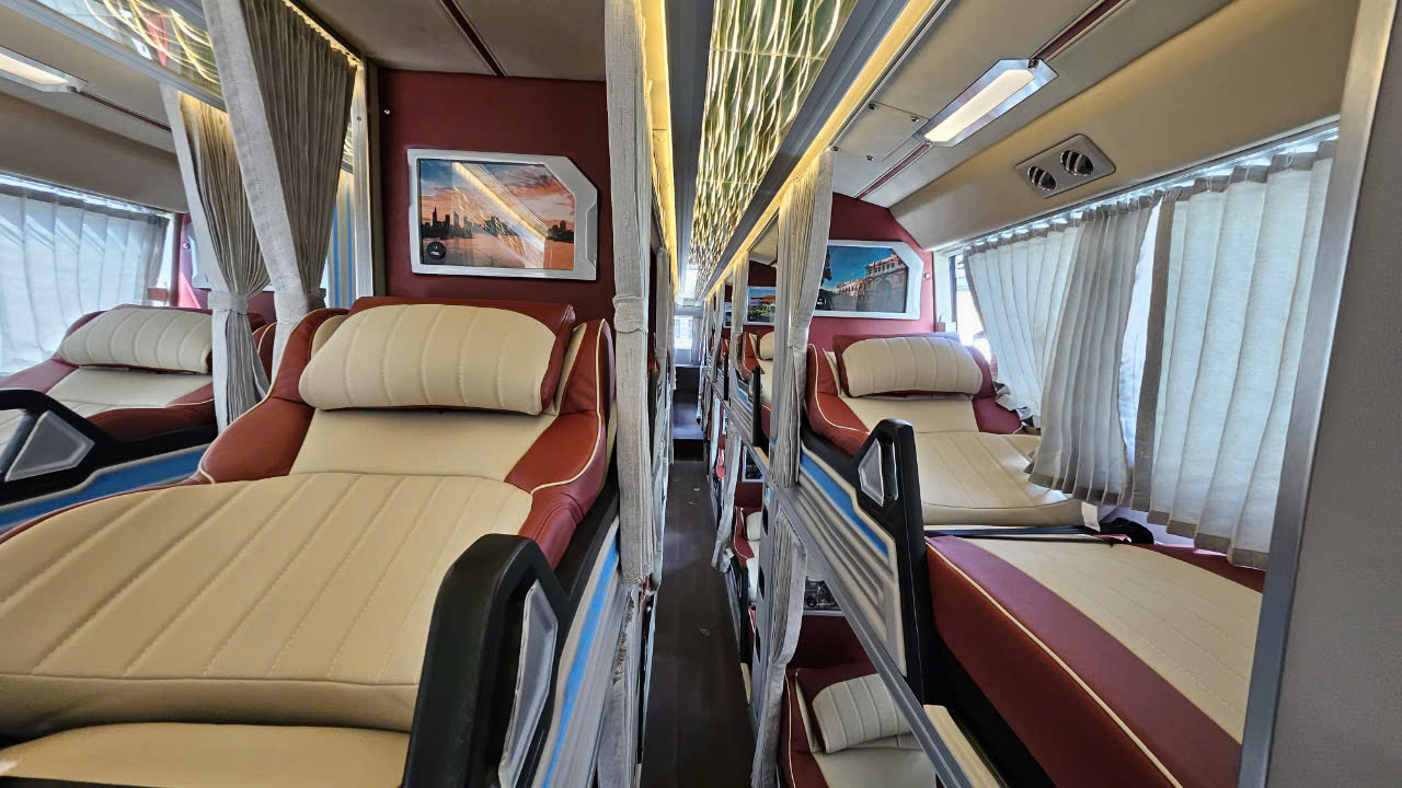 - Khoang hành khách được lựa chọn ghế theo yêu cầu, trang bị đèn trần giọt sương, sàn vân gỗ, đèn kệ hành lý, rèm xe... Đặc biệt không gian rộng rãi thoãi mái...