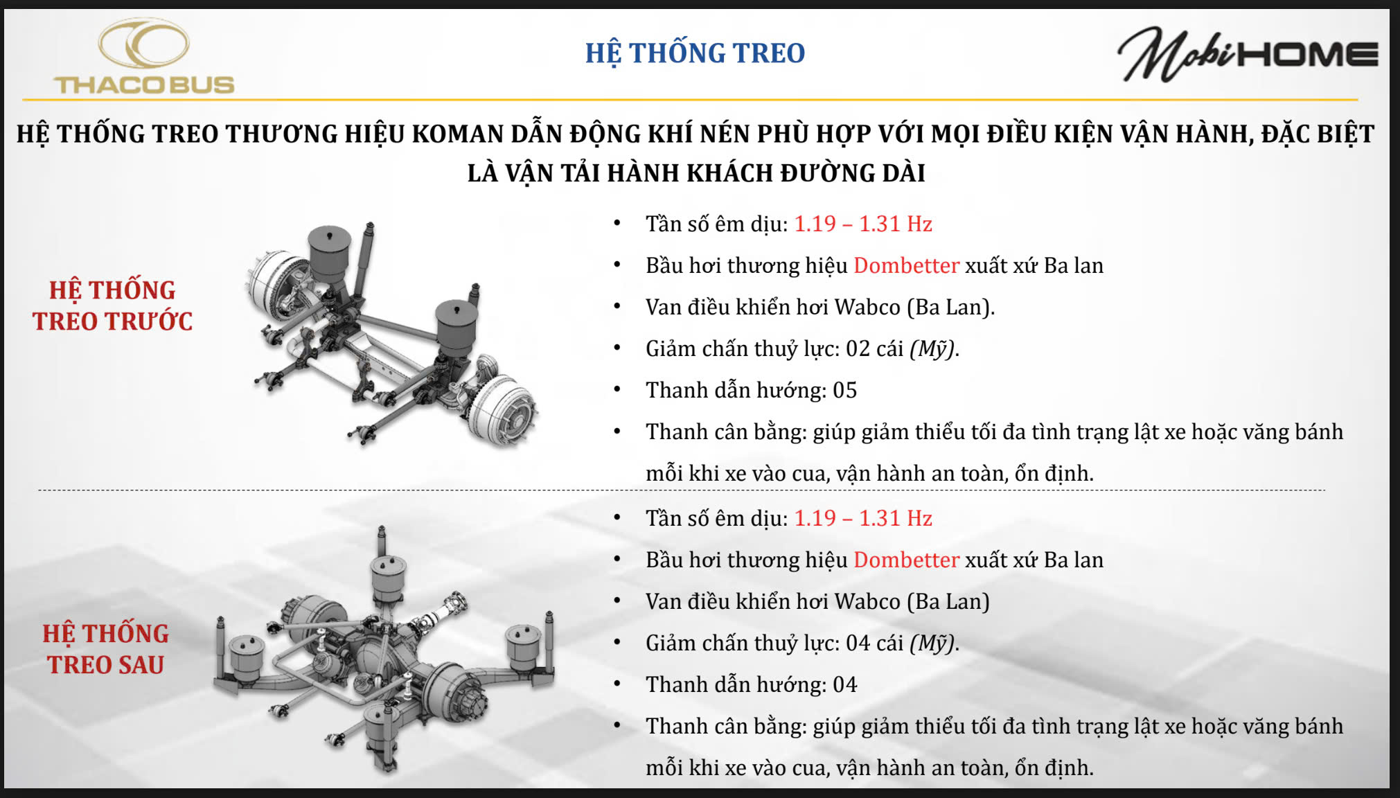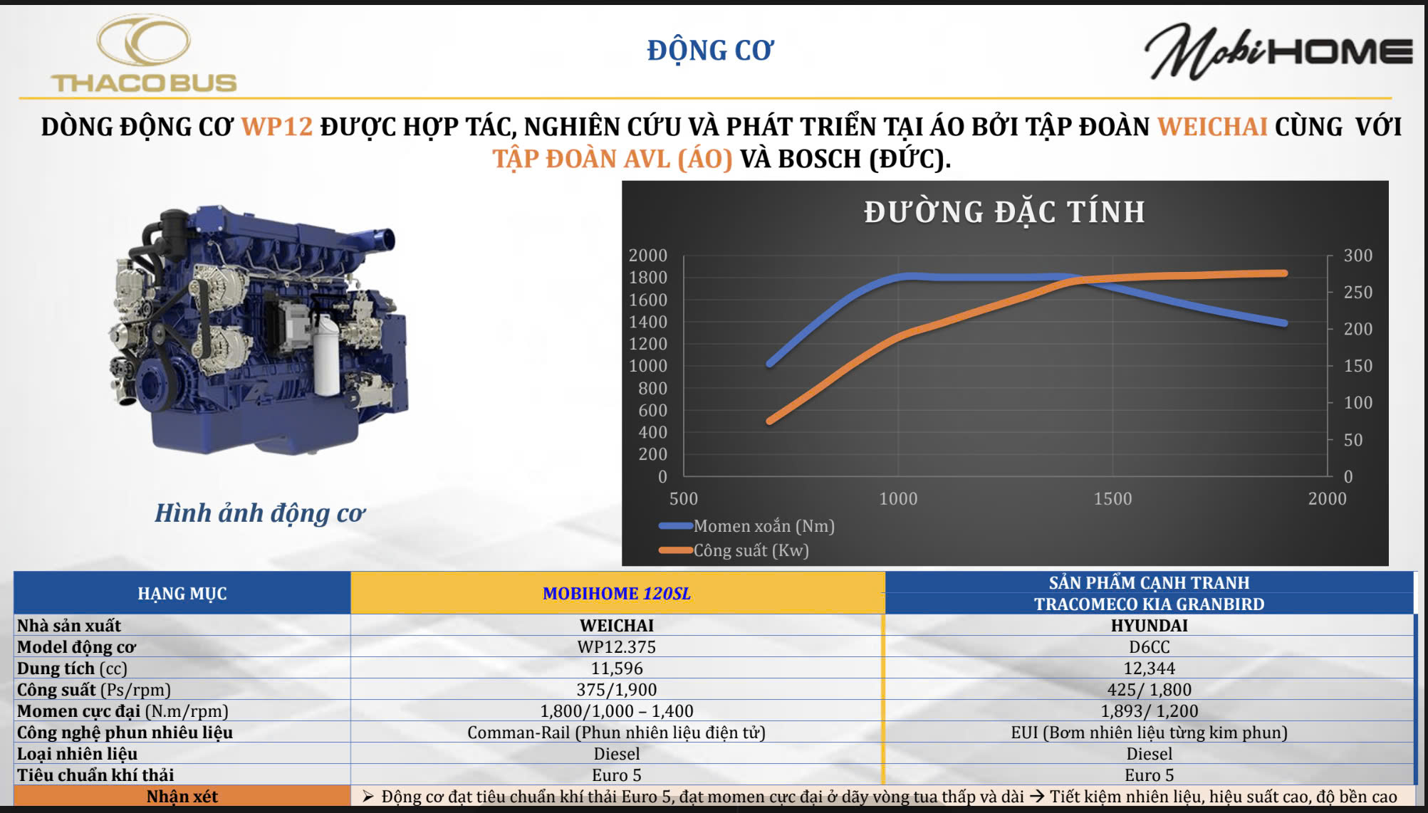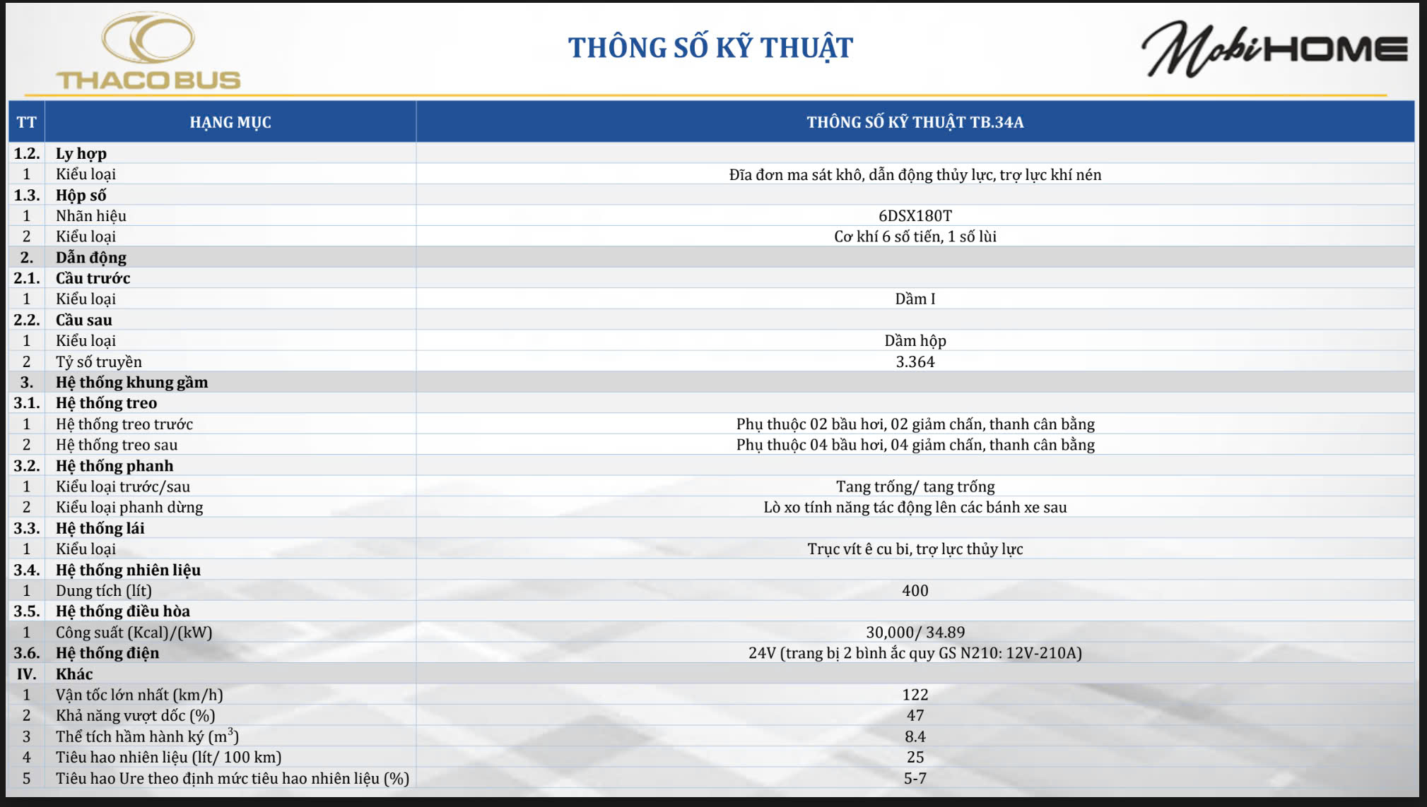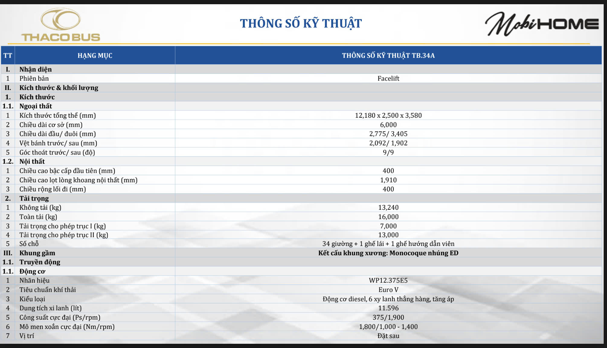 Thaco xe giường 34 chỗ (New Mobihome) được trang bị Động cơ Weichai công nghệ mới với hệ thống phun nhiên liệu điều khiển điện tử Common Rail System (CRD-i), mạnh mẽ và tiết kiệm nhiên liệu, đáp ứng tiêu chuẩn khí thải Euro V, thân thiện với môi trường. Ưu điểm nổi bật về công nghệ nằm ở động cơ xe được đặt phía sau, giúp bố trí sàn rộng và thoáng. Hệ thống treo khí nén được trang bị loại 6 bầu hơi bởi nhà cung cấp Komman – Đức giúp xe vận hành êm dịu và ổn định trên mọi điều kiện địa hình. Thaco xe giường 34 chỗ (New Mobihome) được trang bị đầy đủ tiện nghi cao cấp, đồng thời ghi điểm bởi nhiều tính năng vượt trội, hiệu quả, kinh tế và thân thiện với môi trường, nội thất tiêu chuẩn sang trọng và đẳng cấp, Thaco xe giường 34 chỗ (New Mobihome) phù hợp hướng đến phục vụ hoạt động du lịch, lữ hành đồng thời góp phần phát triển giao thông đô thị Việt Nam chất lượng, văn minh trong thời đại mới.