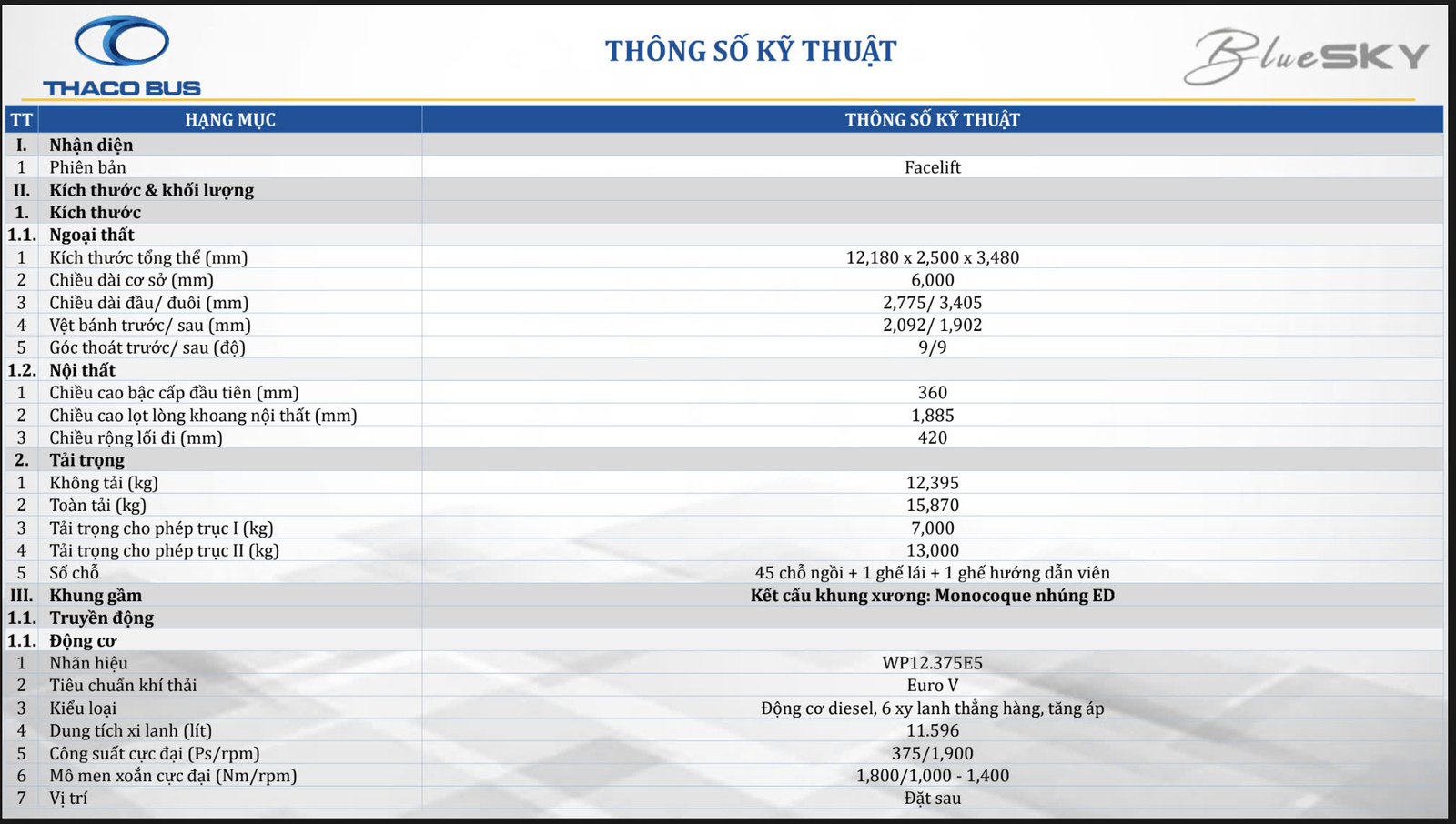 Dòng xe 47 chỗ TB120 máy 375 Ps, bản đủ.