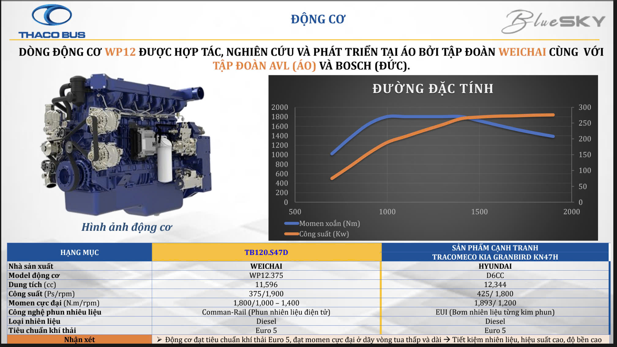 Thaco xe khách 47 chỗ (Blue Sky) được trang bị Động cơ Weichai công nghệ mới với hệ thống phun nhiên liệu điều khiển điện tử Common Rail System (CRD-i), mạnh mẽ và tiết kiệm nhiên liệu, đáp ứng tiêu chuẩn khí thải Euro V, thân thiện với môi trường. Ưu điểm nổi bật về công nghệ nằm ở động cơ xe được đặt phía sau, giúp bố trí sàn rộng và thoáng. Hệ thống treo khí nén được trang bị loại 6 bầu hơi bởi nhà cung cấp Komman – Đức giúp xe vận hành êm dịu và ổn định trên mọi điều kiện địa hình. Thaco xe khách 47 chỗ (Blue Sky) được trang bị đầy đủ tiện nghi cao cấp, đồng thời ghi điểm bởi nhiều tính năng vượt trội, hiệu quả, kinh tế và thân thiện với môi trường, nội thất tiêu chuẩn sang trọng và đẳng cấp, Thaco xe khách 47 chỗ (Blue Sky) phù hợp hướng đến phục vụ hoạt động du lịch, lữ hành đồng thời góp phần phát triển giao thông đô thị Việt Nam chất lượng, văn minh trong thời đại mới.