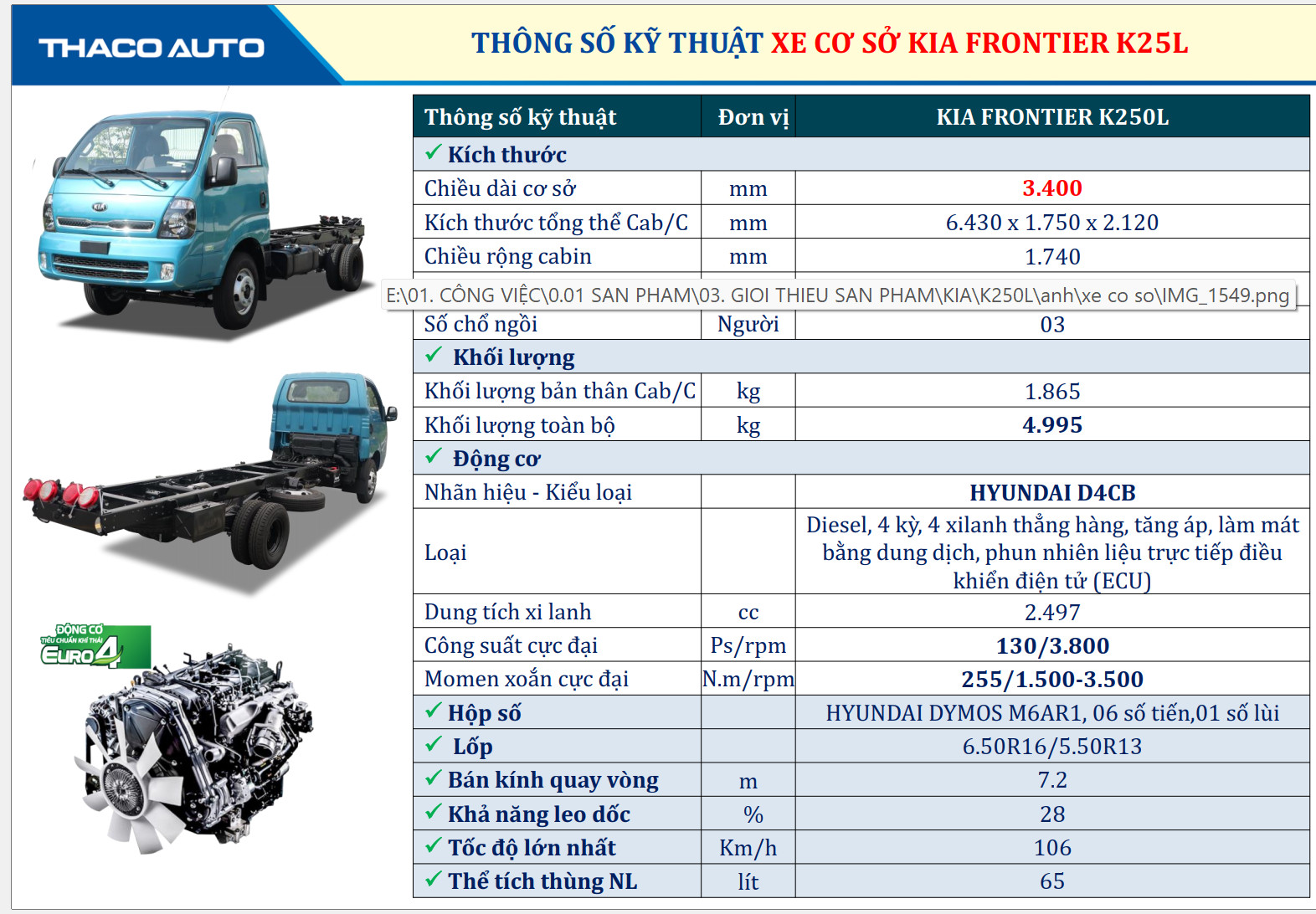 KIA FRONTIER K250L tải trọng và kích thước thùng: