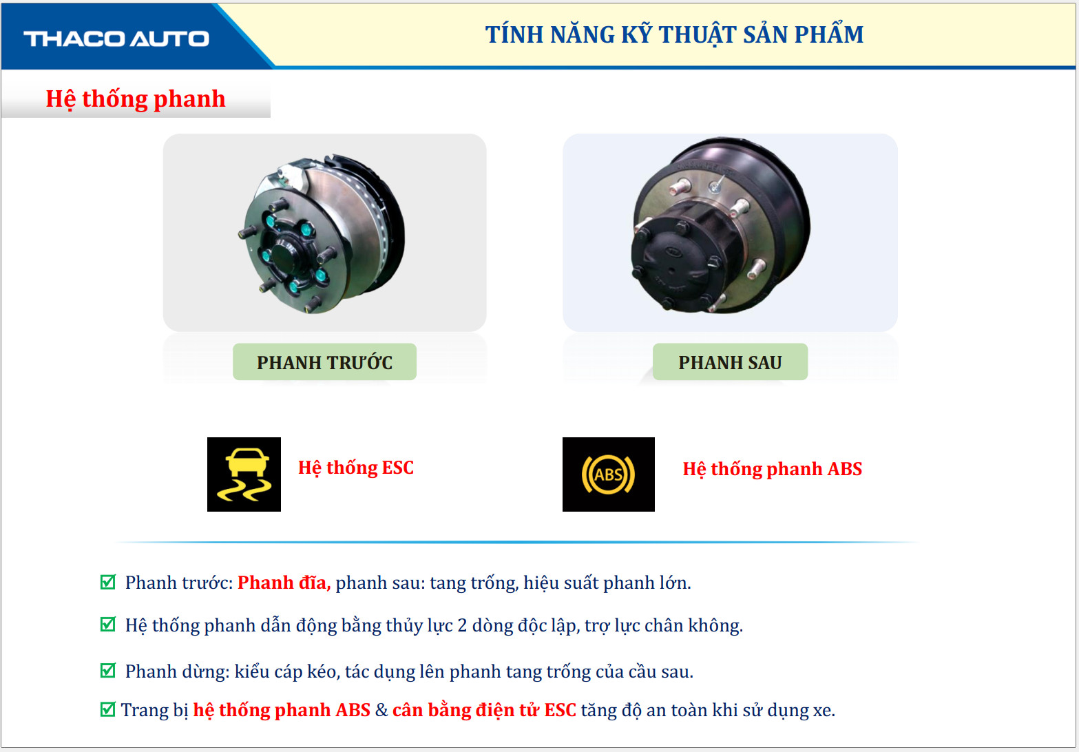 Đĩa/ Tang trống, dẫn động thủy lực, trợ lực chân không. Trang bị hệ thống chống bó cứng phanh (ABS), hệ thống cân bằng điện tử (ESC). |