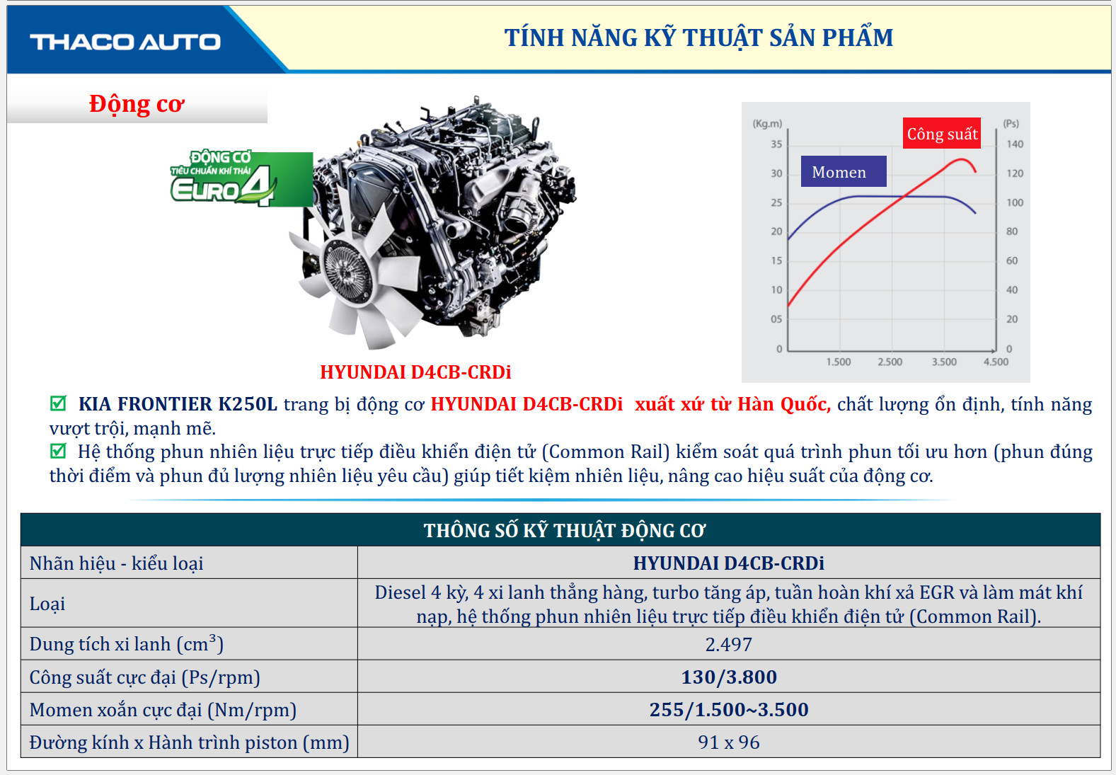 Kia New Frontier K250L, tải trọng từ 2.35 - 2,49 tấn, được trang bị động cơ Hyundai D4CB tiêu chuẩn khí thải Euro 4, vận hành mạnh mẽ, thân thiện với môi trường. Cabin kiểu mới, thiết kế hiện đại được sơn nhúng tĩnh điện nguyên khối và sơn màu với công nghệ Metalic, các tiện ích được trang bị sang trọng như đối với ô tô du lịch. Hộp số gồm 06 số tiến + 01 số lùi, có 2 tỉ số truyền nhanh giúp xe vận hành mạnh mẽ và linh hoạt.