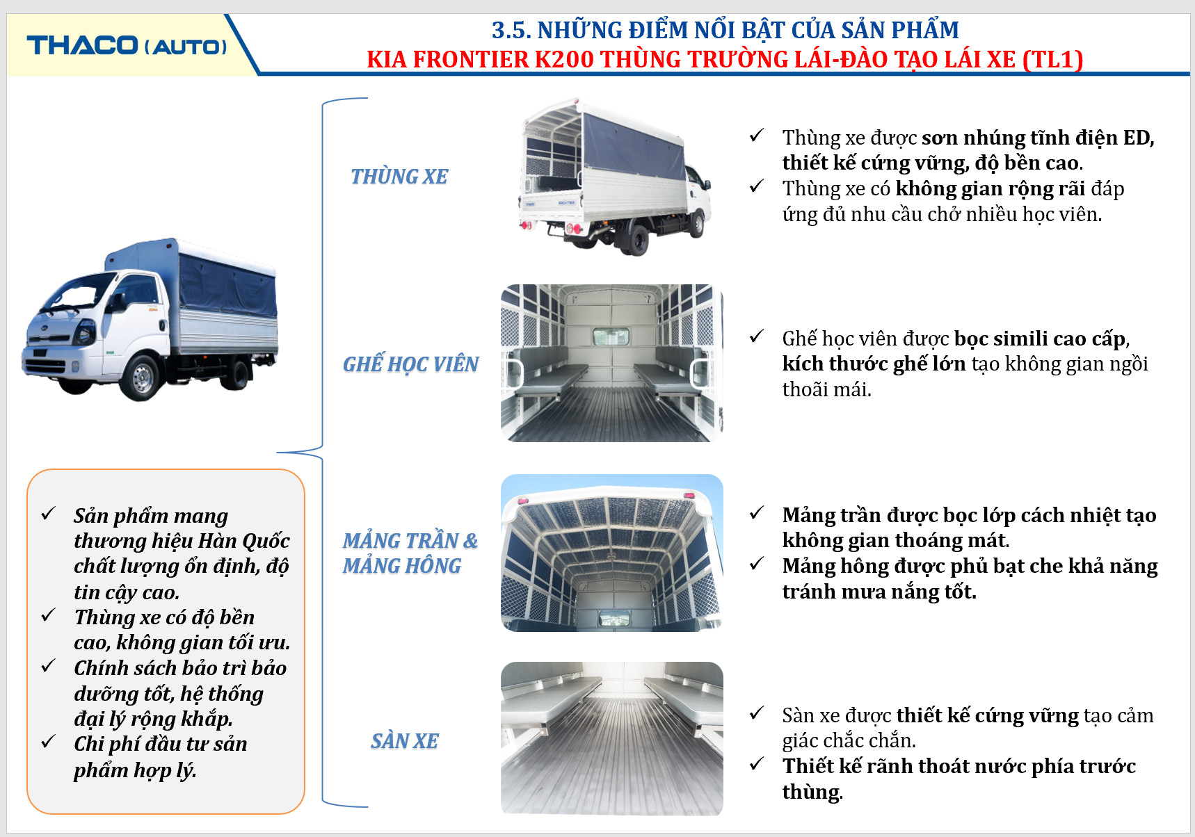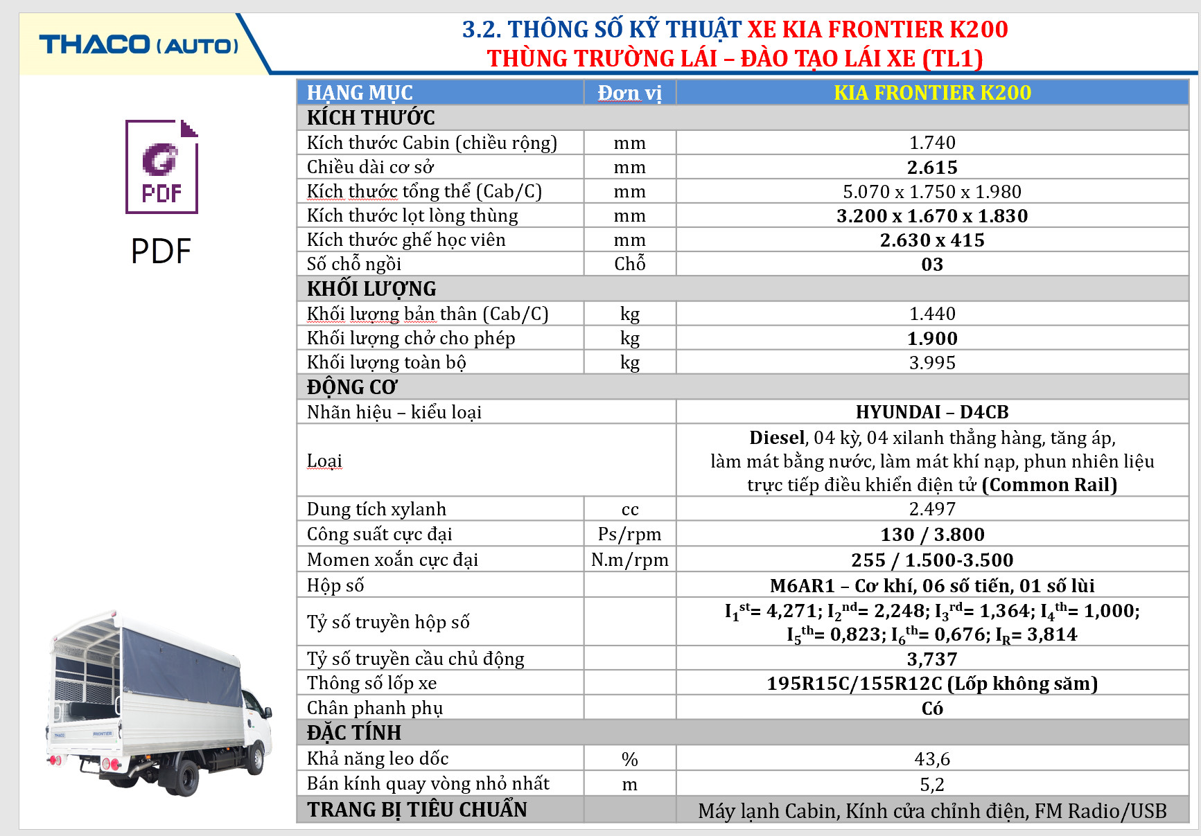 Kia New Frontier K200 Thùng trường lái (đào tạo lái xe), tải trọng 1,9 tấn, được trang bị động cơ Hyundai D4CB tiêu chuẩn khí thải Euro 4, vận hành mạnh mẽ, thân thiện với môi trường. Cabin kiểu mới, thiết kế hiện đại được sơn nhúng tĩnh điện nguyên khối và sơn màu với công nghệ Metalic, các tiện ích được trang bị sang trọng như đối với ô tô du lịch. Hộp số gồm 06 số tiến + 01 số lùi, có 2 tỉ số truyền nhanh giúp xe vận hành mạnh mẽ và linh hoạt.